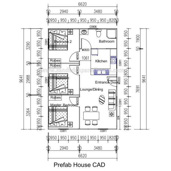 This project is a prefab sample house in Spain. The advantages of prefab house over concrete building is low cost and fast construction. The prefab home is equipped with a bottom steel structure. Before the construction, only the concrete block needs to be prepared in advance under the foot support. So a large area of concrete foundation is not needed. This way saves concretes, and then saves a lot of money! The prefab home has 3 rooms, 1 living room, 1 bathroom, and an open kitchen. The total construction area is 63.81 square meters, and the bottom frame is composed of bottom purlins, foot supports, 15mm thickness plywood.